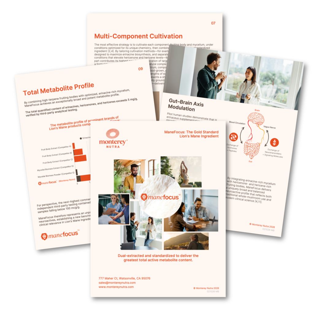 With over 55 years of expertise in mushroom cultivation and genetics, the Monterey Nutra ingredient portfolio was built on the passion and dedication of farmers and scientists to shape the future of mushrooms as functional ingredients. Our California-grown strains are certified organic, vegan, non-GMO, and third-party tested for heavy metals and toxins. With state-of-the-art extraction technologies and industry-leading potency and solubility, we help you clear the path to improved mushroom formulations.